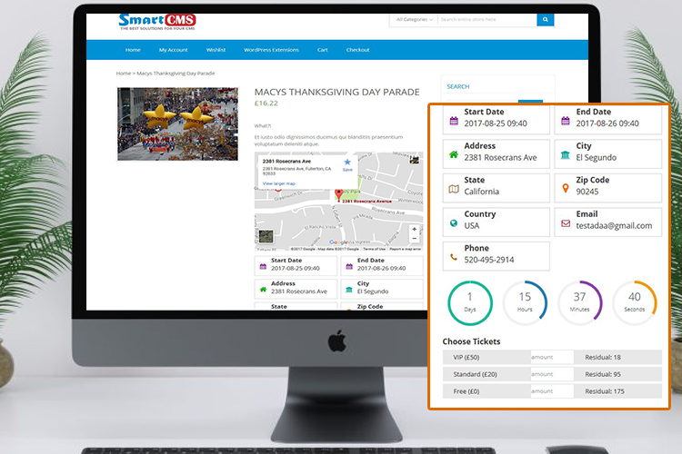 On the product(event) page in front-end, the customer can see the google map, event information. Countdown timer display base on end date of event.
