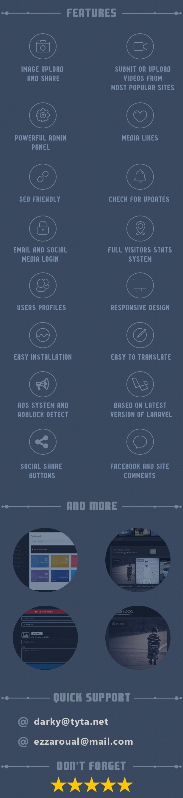 Darky is a PHP script based on latest version of Laravel Framework (5.2). Users can upload videos from their devices or submit from the most popular sites like: Youtube, Vimeo, Dailymotion, Metacafe and Vine. Also they can upload pictures.