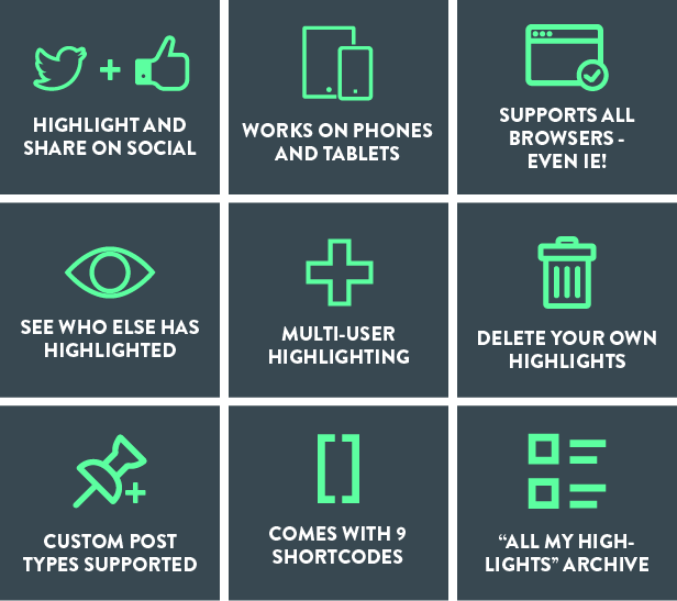 Comes with 9 built-in shortcodes for displaying all kinds of information about your highlights, from the top 10 most highlighted posts, to the single most highlighted selection of all time, to a simple directory list of every single highlighted selection from your site or a specific/current user.
