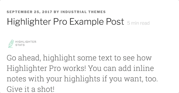 Highlighter Pro lets you highlight the text directly on the page and add notes and comments inline with your highlights. You can save and delete your highlights, view all of your existing highlights, view other readerâs highlights, and view conversations inline that other readers are having about your content. It comes with a full statistics engine that keeps track of trending posts by number of highlights, number of notes, number of total highlighters, and many other metrics to sort your posts by. It works on posts, pages, homepage, archive listing page, and custom post types.