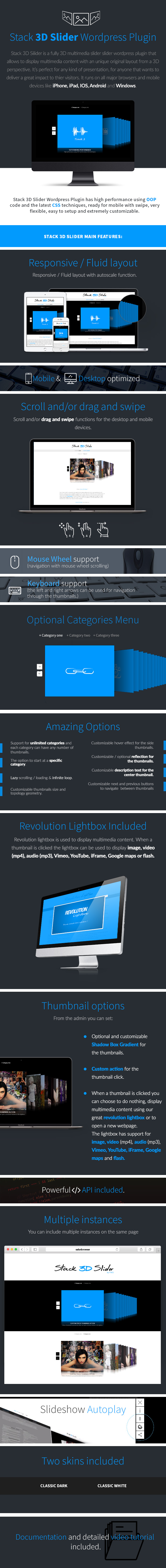 Stack 3D Slider Wordpress Plugin is a fully 3D multimedia slider slider plugin for any wordpress theme that allows to display multimedia content with an unique original layout from a 3D perspective. Itâs perfect for any kind of presentation, for anyone that wants to deliver a great impact to thier visitors. It runs on all major browsers and mobile devices like iPhone, iPad, IOS, Android and Windows. When a thumbnail is clicked you can choose to do nothing, display multimedia content using our great revolution lightbox or to open a new webpage. The lightbox has support for image, video (mp4), audio (mp3), Vimeo, YouTube, iFrame, Google maps and flash. Stack 3D Slider Wordpress Plugin has high performance using OOP code and the latest CSS techniques, ready for mobile with swipe, very flexible, easy to setup and extremely customizable.