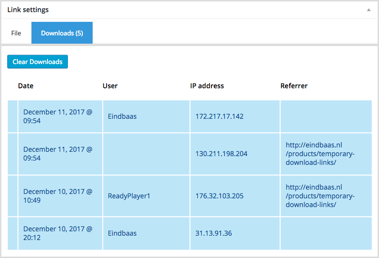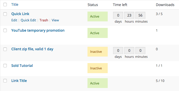Temporary Download Links for WordPress With the plugin Temporary Download Links for WordPress you can create an non-direct download link for any file in your Media Library. Share the link anywhere by copy & pasting the temporary URL. The link will expire automatically after a set time or after a number of downloads have occurred. - Create temporary download links for any file in your Media Library - Automatically expire download links after a time limit or download limit - Know when and how many times the file has been downloaded.